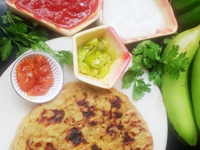 Make small balls out of the kneaded wheat dough. Roll them out into small chapatis. Place one tablespoon of the prepared raw banana mixture in the center of each chapati. Fold it like a pouch, then gently flatten and roll it into a round paratha, dusting with a little wheat flour if needed.