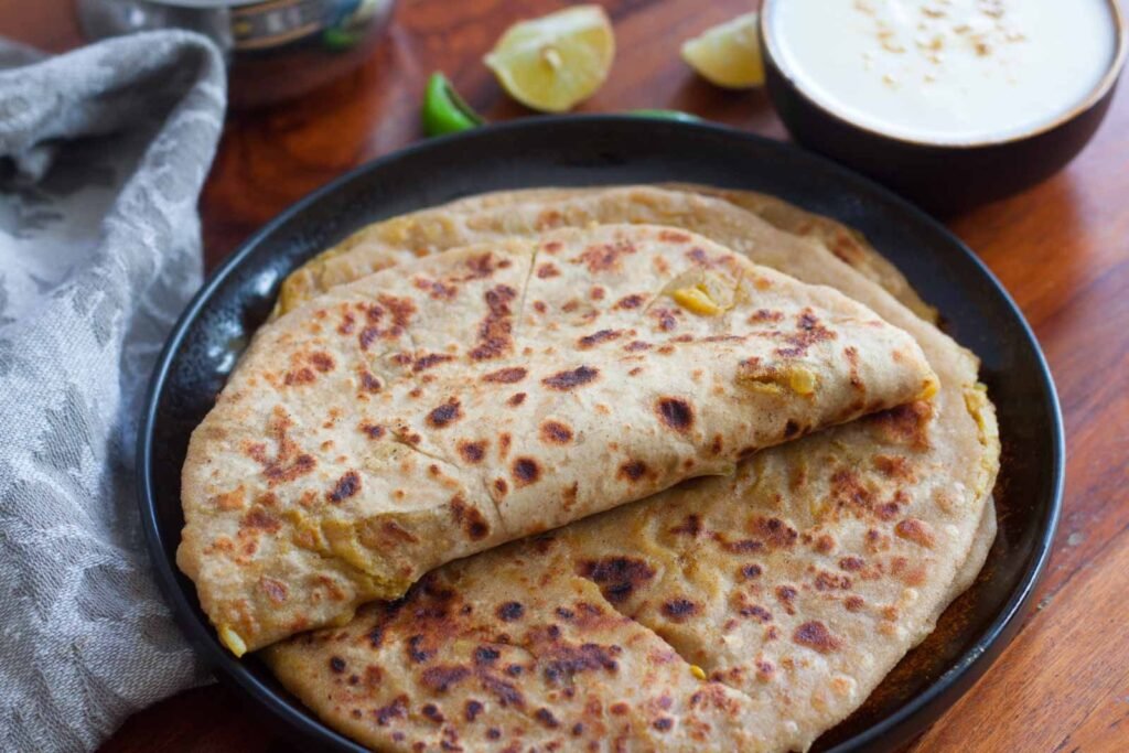 Keep the parathas covered with a clean white cloth until serving. Before serving, cut them into semicircles or triangles and serve hot with vegetable curry or curd.